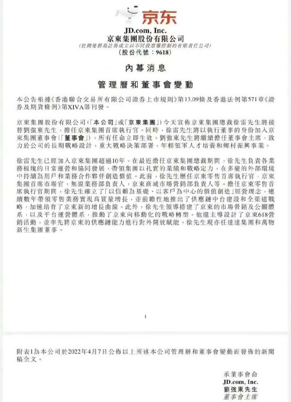 4月7日,京东集团宣布,京东集团总裁徐雷出任京东集团CEO,将负责日常运营管理,向京东集团董事局主席刘强东汇报;刘强东将把更多精力投入到长期战略设计、重大战略决策部署、年轻领军人才培养和乡村振兴事业中。