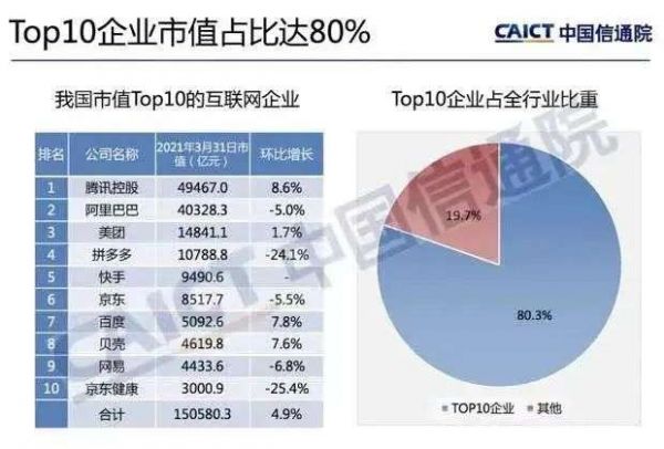 中国信通院发布的《2021年一季度我国互联网上市企业运行情况》研究报告显示,2021年一季度,我国11家企业上榜全球互联网企业市值Top 30;市值Top 10的互联网企业占全行业比达80.3%,十家企业市值总和为150580.3亿元;腾讯控股与阿里巴巴分别以49467亿元和40328.3亿元市值排名第一、二位,第三到第十位的企业依次是美团、拼多多、快手、京东、百度、贝壳(KE)、网易、京东健康。