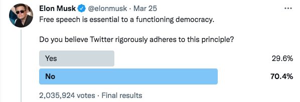 今年3月,马斯克曾经在个人Twitter上发布一项投票询问粉丝:请投票,你觉得Twitter有遵守“Free Speech”的原则吗?与此同时,马斯克还表示:“这个投票相当重要。请小心投下你的一票。”