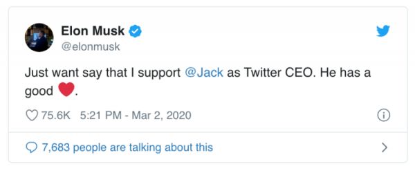 马斯克一直是多西的好友,在后者被投资者逼宫期间,马斯克在推特上表示对老友的支持,“我只想说我支持杰克·多西担任推特的CEO,因为他有一颗善良的心。”