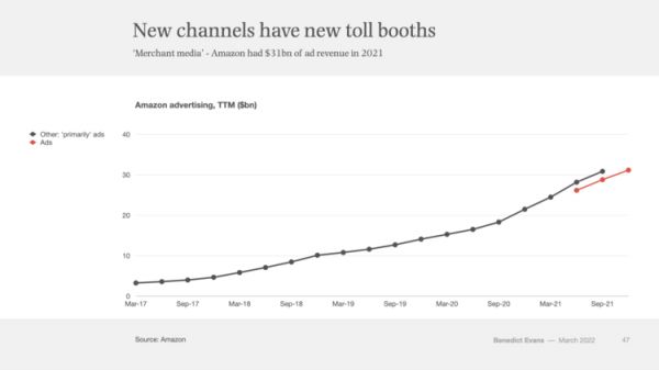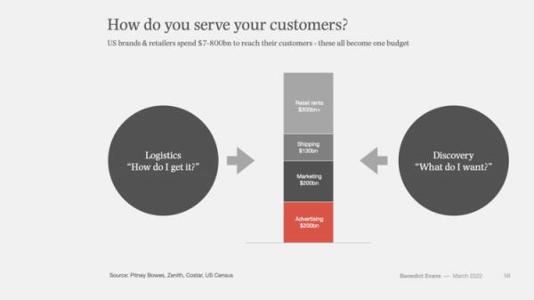 编者按:最近2年,在疫情的催化下,电子商务在国外出现了加速。线上交易在零售市场的占比越来越大,实体店变得越来越少,电视节目订阅户也变得越来越少。那么那些原本投放在这些地方的广告预算都到哪儿去了呢?原本用来租店面的钱又用到什么地方了呢?本文试图探讨这些问题。文章来自编译。