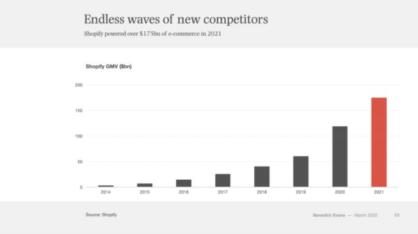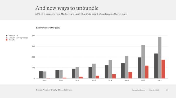 Shopify 1750 亿美元的 GMV大概是Amazon Marketplace规模的 45%。对于竞争监管机构来说,这是个很有趣的问题,因为Shopify不是面向消费者的品牌,所以按照传统的市场定义,它与亚马逊并没有构成竞争关系——我怀疑两家公司都会同意这一点。