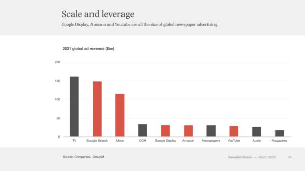 Google Display、Amazon、Youtube的广告收入已经与全球报纸广告总和差不多