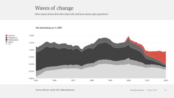 因此,在我上面的那张广告收入图表里面,一个显而易见的故事是平面媒体的崩溃以及互联网的增长,但对我来说,更有趣的地方是收入的下降:美国的广告在GDP 的份额占比已经缩水了三分之一。原因有二,一是互联网广告要便宜得多,效率要高得多,二是广告正经历着大量的重新分类。如果汽车经销商过去的做法是在当地报纸购买了 20 页的广告插页,但现在只为一支谷歌搜索广告支付费用(想象下会有多少人会为“宝马旧金山经销商”这个词条广告去竞价?),然后把剩余的预算花在运营自己的网站上?这个是不会体现在广告的数字里面的。
