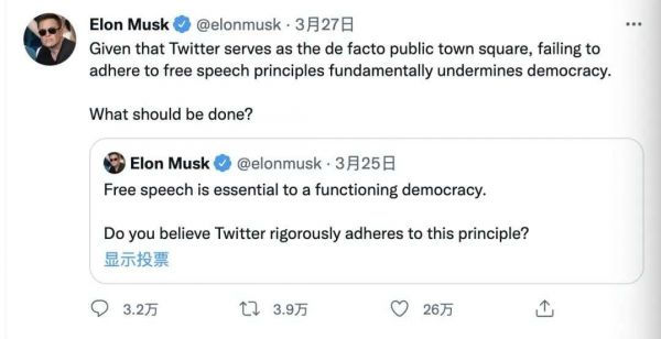 入股消息发出一周前,马斯克就对于推特的「言论自由」问题发布多条推文,现在看来那时就已经成为第一股东,俨然一副「主人翁」姿态。