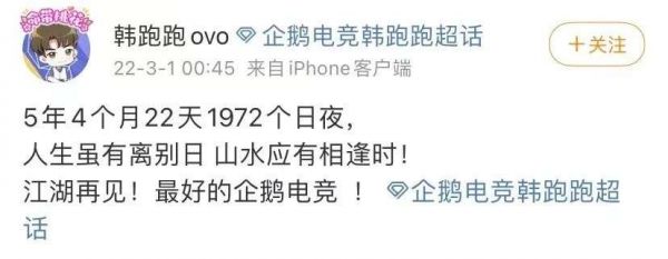 今年3月初,拥有超700万粉丝的大主播韩跑跑发文称:“5年4个月22天,1972个日夜,人生虽有离别日,山水应有相逢时。江湖再见,最好的企鹅电竞。”