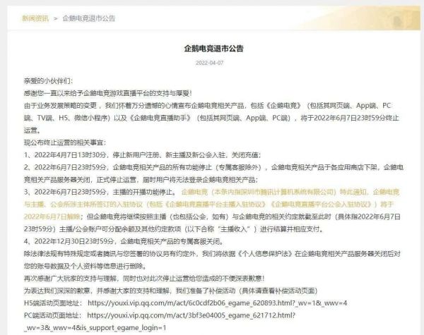 4月7日,腾讯旗下移动电竞内容平台“企鹅电竞”发布公告,宣布由于业务发展策略的变更,企鹅电竞相关产品将于2022年6月7日23时59分终止运营。