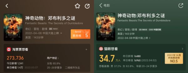 截至目前,《神奇动物3》的猫、淘想看总人数已经超过了60万人。