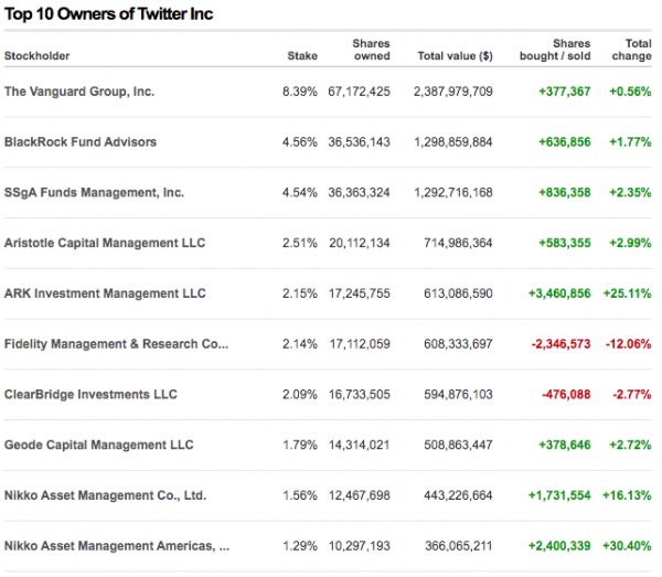 值得注意的是,在马斯克向推特砸钱之前,推特最大的五个股东为先锋领航投资公司( the Vanguard Group )、黑石基金(Blackrock Fund)、Ssga资金管理公司、Aristotle 资本管理公司以及Ark投资管理公司。