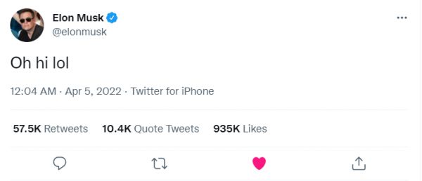 在众多国内外媒体把“马斯克成为推特最大股东”的消息竞相报道后,马斯克本人在其个人推特上只做出了这样的回应。虽然这一回应很简单,但马斯克在推特上砸了几十亿美元。