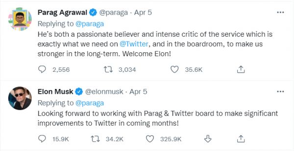 据《华尔街日报》报道,在马斯克买入推特9.2%的股票后,推特首席执行官帕拉格·阿格拉瓦尔等高管与马斯克频繁通话,决定给马斯克提供一个董事会席位。按照与推特的约定,马斯克在董事会任期期间,其持股比例不得超过推特的14.9%。