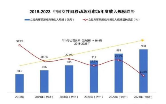 据“17173中国研习研发力量调查”,预计2023年中国女性向游戏市场规模将达到958亿元,2018-2023年的年均复合增长率为18.4%。