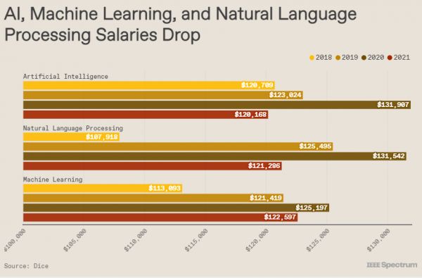 听了这话,不由得使人感到疑惑,人工智能近年来早就成为了就业蜜罐子,工资高且社会影响大,吸引了无数学术人才,怎么会遭此待遇。可仔细一查才发现,据IEEE Spectrum数据显示,相比2020年,2021年机器学习、自然语言处理和人工智能这三领域的薪资分别降低了2.1%、7.8%和8.9%,降幅超11739美元。