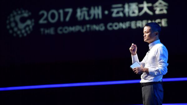 图为马云在2017年云栖大会演讲