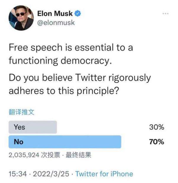 今年3月,马斯克在个人推特上发布一项投票,询问粉丝:“你觉得推特有遵守‘言论自由’的原则吗?”他还暗示道:“这个投票相当重要。请小心投下你的一票。”如今看来,这是马斯克对入主推特的一次预告。