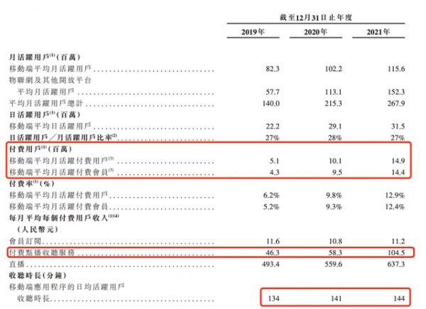 另一项重要数据在于,喜马拉雅的付费用户粘性正在大大提高。平均每位付费用户的付费点播收听服务从2019年的46.3元增加到了104.5元。2021年,日活用户的收听时常也提高到了144分钟。