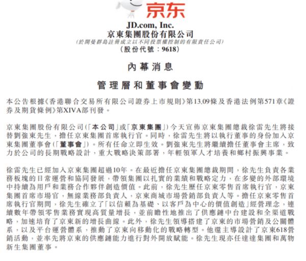 4月7日早间消息,京东集团在港交所发布公告,宣布刘强东将不再兼任京东集团CEO一职,京东集团总裁徐雷升任。刘强东仍将继续担任京东董事局主席一职。