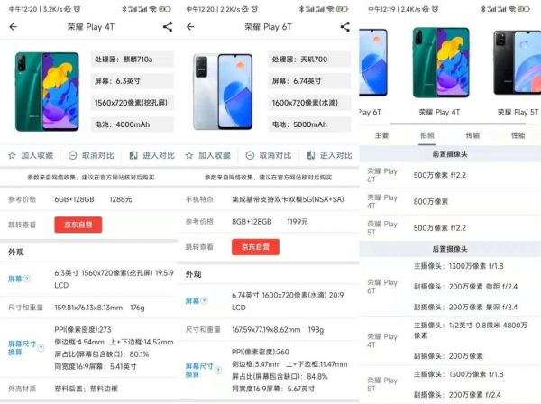 再来看看荣耀Play6T,这款产品搭载了联发科天玑700 5G处理器、采用6.7英寸 720P 90Hz LCD水滴屏;配备5MP前置镜头、13MP+2MP+2MP后置三摄;内置 5000mAh 电池,支持22.5W快充。