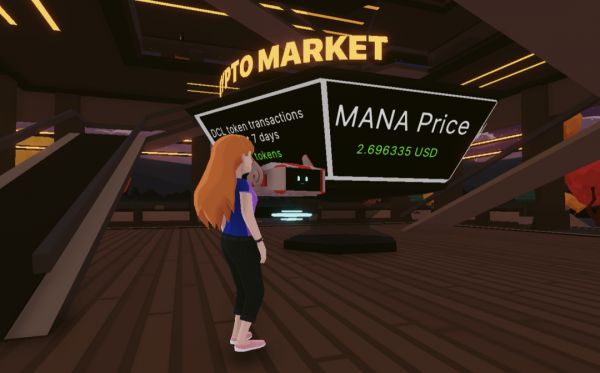 在时装周的会场大厅上方,一个类似于股票交易大厅的显示屏上,不断显示主办方 Decentraland 的代币 MANA 与美元的汇率对比——从初始的 0.024 美元到去年年末的 4.5 美元,MANA 在短期内暴涨近 200 倍。目前 MANA 代币价格稳定在 2.7 美元左右。