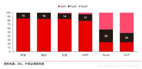 虽然都进行了业务布局上的规划和调整,也砸了真金白银,可目前实现盈利的只有阿里云一家,这和国内云计算行业整体停留在IaaS层关系很大。根据IDC数据,去年SaaS业务占全球公有云服务收入构成的63.6%,而国内SaaS服务在收入中占比仅为28.2%。