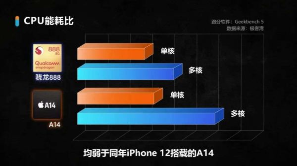 再从数据上看看两代旗舰处理器,在CPU测试中,骁龙888单核多核能耗比均弱于同年iPhone 12搭载的A14。