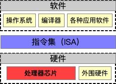x86、Arm、RISC-V都是指令集(又称ISA、架构[5]),指令集是对软硬件的一套标准规范,不具备实体,利用这套规范可以设计对应的处理器芯片和软件系统。打个比方来说,软件是螺母,硬件是螺钉,指令集就是螺母螺钉的尺寸规范。[6]