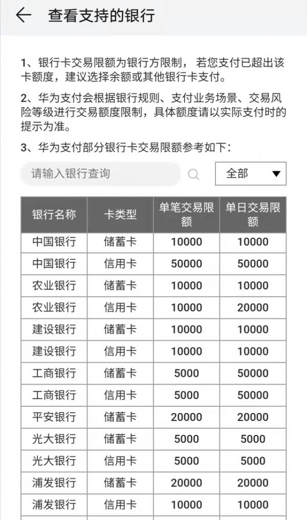 华为支付当前也已支持数百家银行卡的绑定,包括工商银行、农业银行、建设银行、中国银行、邮储银行、交通银行、平安银行、招商银行等。