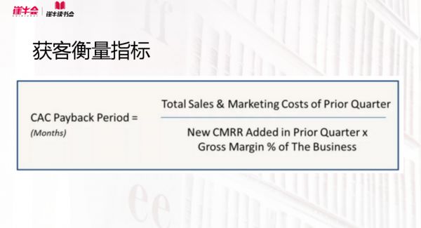 月客户获取成本投资回收期=上一季度销售与营销费用总和/上一季度新增已承诺月经常性收入×毛利率