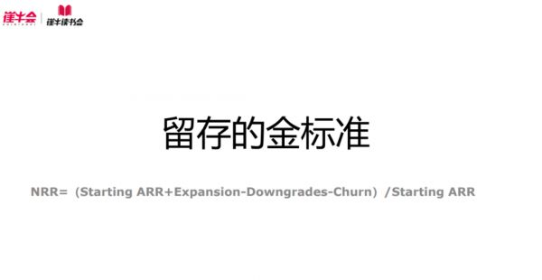 挽留率怎么考核呢,这里有一个考核留存的金标准,NRR(Net Retention Rate, 净留存率,如果是美元则为NDR,Net Dollar Retention)。NRR 是 SaaS 公司非常重要的评估指标之一,指的是去年付费客户在今年贡献的收入除以他们去年贡献的收入,它是行业里的一个金标准。