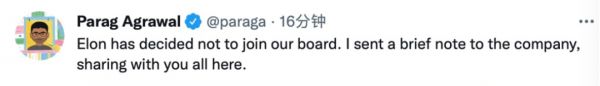 4月11日,推特CEO Parag Agrawal发布推文称:“埃隆·马斯克决定不加入我们的董事会。”