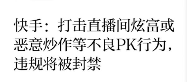 快手平台就发现部分用户为博取关注,在直播pk环节中进行低俗游戏、斗狠互撕、诱导打赏、炫富或恶意炒作等不良行为,为落实企业的主体责任,维护良好的平台生态环境,平台已通过技术手段与人工审核等方式进行严格审查,一经发现违规,将给出直播封禁、帐号封禁等处罚。