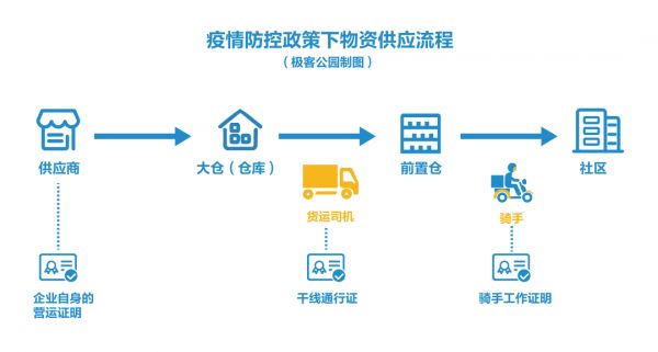 据极客公园了解,根据疫情防控政策,保供企业会涉及到三种通行证的办理:第一,针对货运司机,需要办理干线通行证(明确车牌、司机,一人一车通行);第二种,配送骑手的工作证明(需骑手持有抗原检测,或 24 小时核酸检测报告),如果骑手在路上被关卡拦截,出示证件即可继续跑单。第三类为企业自身的营运证明。店、车、人需三证齐全才能保证供给和运力。