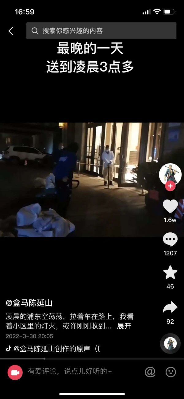 几天前有同事开玩笑互相打气,大家谈起一首叫做《孤勇者》的歌,「我 3 月 29 日第一次听,挺喜欢那句『谁说站在光里的才算英雄』」陈延山说,那天晚上,运送物资的路上,他拍了一段视频留念,突然一感念,在视频里说出「(我们)像一个孤独的勇者。」