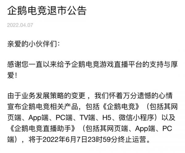 4月7日,腾讯旗下移动电竞内容平台“企鹅电竞”发布退市公告,称“因业务发展策略变更,将于6月7日23时59分终止运营。”面对这一停运结果,熟悉游戏直播的用户,并不觉得意外。