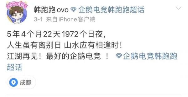 企鹅电竞主播韩跑跑发文告别,图源韩跑跑个人微博