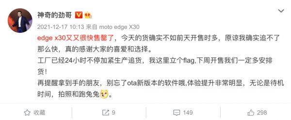 对此,2021年12月17日,微博认证为联想中国区手机业务部总经理的用户“神奇的劲哥”就表示:“edge x30又又很快售罄了,今天的货确实不如前天开售时多,原谅我确实追不了那么快”。