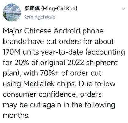 2022年3月21日,天风国际分析师郭明錤在社交媒体发文称,今年中国主要安卓手机厂商已削减约1.7亿部订单,占原2022年出货计划的20%。