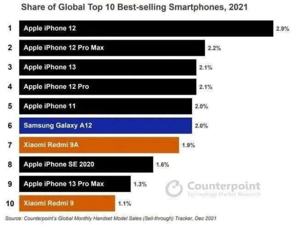 2021年全球TOP10畅销手机TOP 10排名图源:Counterpoint
