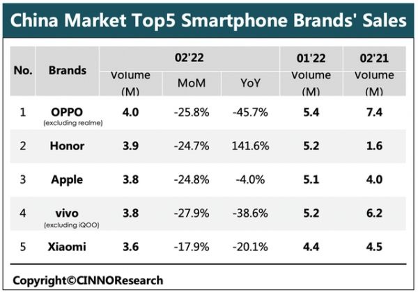 CINNOResearch发布的数据显示,2022年2月,如果不考虑荣耀独立后出货基数相对较低带来的利好影响,中国前五大智能手机厂商不论是同比,还是环比,“主旋律”都是出货量下跌。