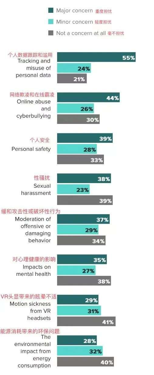 最令人担忧的是个人数据的跟踪和滥用,第二大担忧是元宇宙中的网络欺凌和在线霸凌,44%的人表示这是一个主要的问题,而个人安全和性骚扰分别被39%和38%的受访者提及。