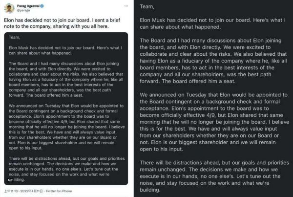 当然,马斯克为什么不加入董事会的真实原因尚未可知,但对于 Twitter 的员工来说,这应该是个「好消息」。从之前马斯克购入股份可能会进入董事会以来,Twitter 的许多员工都对此表示不满,担心他会采取些举动从而对公司带来负面影响。