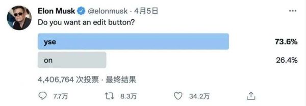 比如,马斯克之前曾经在自己的 Twitter 账号发起投票,询问网友是否想要拥有「编辑」(推文)的功能,最后在 4406764 次投票里有 73.6% 的人投了「是」。