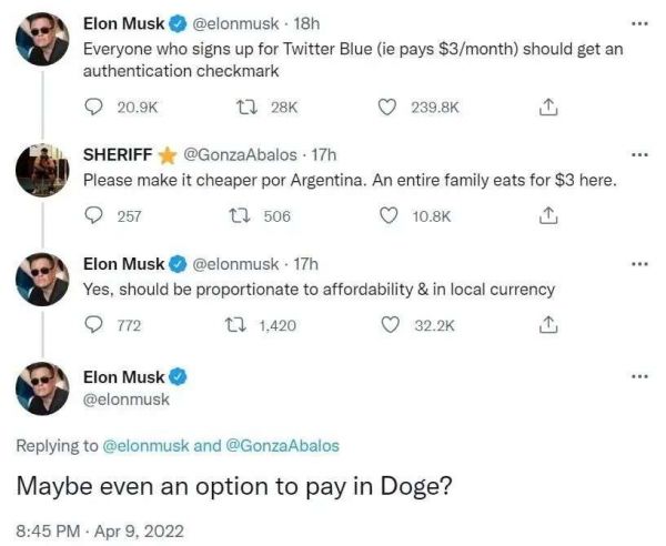除了价格要更便宜,马斯克还认为 Twitter Blue 用户在使用时 应 该没有广告,也应该为这些用户提供用加密货币支付的选项。如果 Twitter 依靠广告资金来生存,那么公司制定政策的权力就会大大增强。