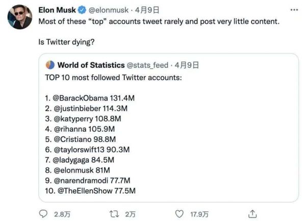 不仅是对 Twitter 的功能提出了自己的想法,马斯克对目前 Twitter 的用户生态也有自己的见解。他列出了目前在 Twitter 上拥有最多关注者的前 10 个账号,然后指出这些「头部账号」大多很少发文。