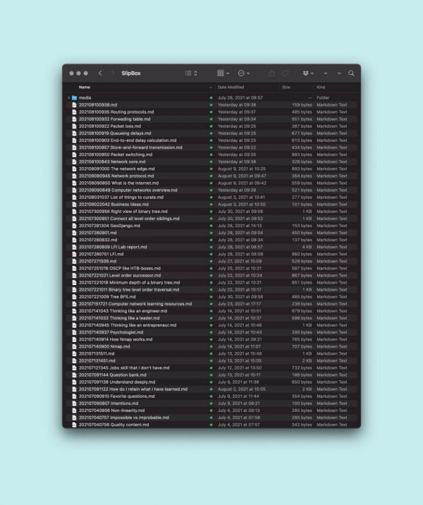 德国著名的社会学家卢曼发明了一种卡片盒笔记法,可以让独立分散的笔记片段形成网络。这些笔记是按主题联系在一起的,而不是按照时间顺序或者按文档类型联系的。笔记片段之间通过手动编写的链接实现交互。