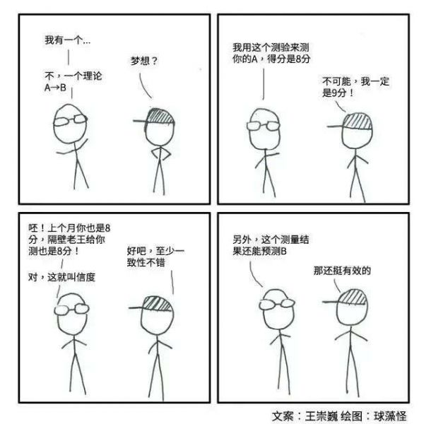 信度简单来说就是测量工具的一致性。比如,尺子是测量身高的工具,信度高的尺子不管是今天测还是明天测,不管是在中国测还是在美国测,不管是你来测还是我来,结果都是一样的。