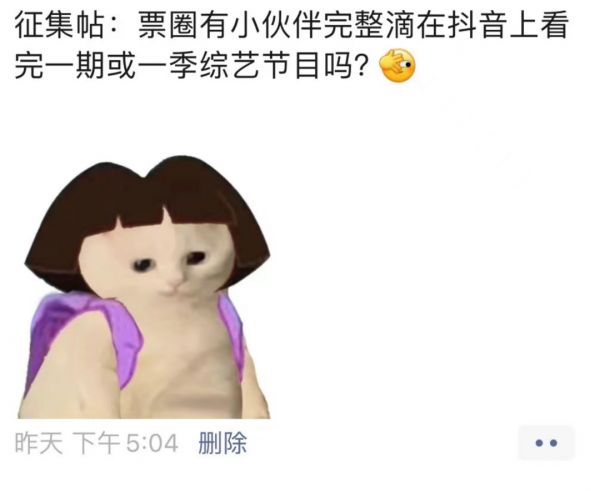于是,娱sir就通过朋友圈、社群发布征集帖,展开了一些围绕“抖音综艺”的讨论。( 样本不多,仅供参考 )