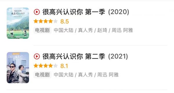 值得一提的是,相较于《奇遇人生》“纪录片+综艺真人秀”深度结合的形式,抖音又迈了一大步。《很高兴认识你》以每周2场直播+7集纪实综艺+N条短视频的形式呈现。不难看出,这是抖音就长短视频融合、反哺,甚至还有内容是否可以为电商赋能的一次尝试。这也是豆瓣截至目前豆瓣评分最高的一档综艺。( 《很高兴认识你》第一季:豆瓣8.5分,6763人评分;《很高兴认识你》第二季:豆瓣8.1分,3344人评分 )