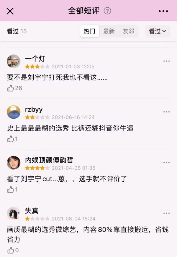 如今再翻看豆瓣上为数不多的评论,几乎都在吐糟。 “画质最糊的选秀微综艺,内容80%靠直接搬运,省钱省力。”