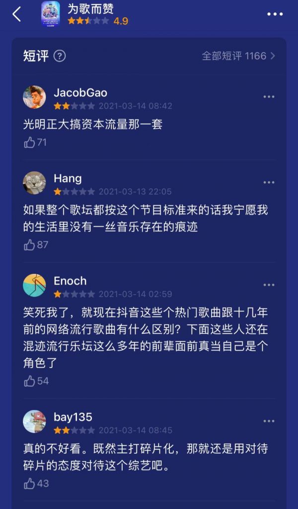 问题出在哪?核心问题在于除了流于表面的加入了所谓抖音博主作为百赞团外,它就是一档常规的音综。且认真看,还不是一档合格的音综,正如爱乐嘉宾马思唯所言—— 百赞团点评环节才是这档节目的中心。 至于音乐,一层综艺皮而言。大多像这样将话题与矛盾放在首位的节目,大概率就很难赢得口碑与认同。( 还有谁,我不说 )